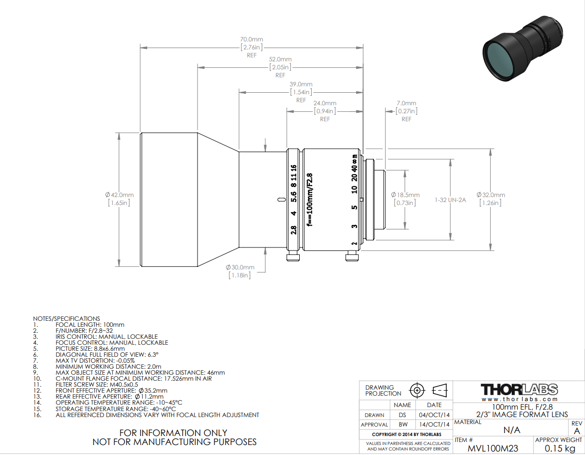 Thorlabs索雷博 MVL100M23 定焦镜头