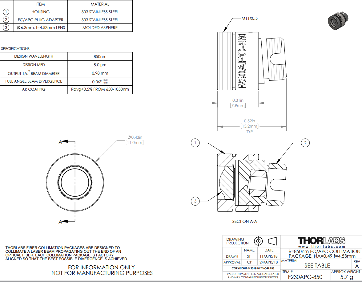 Thorlabs索雷博 F230APC-850 定焦准直器