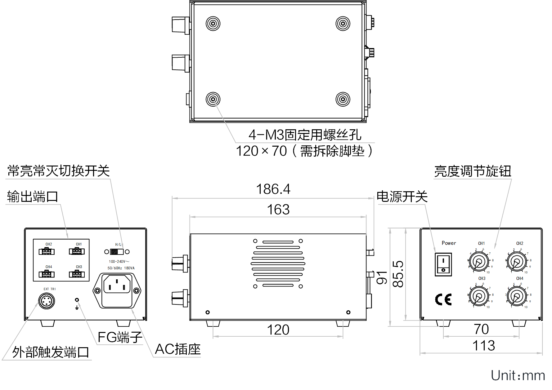 名称 | 模拟恒压光源控制器,120W,4通道,单通道最高输出72W,SMR-03V-BC接头,带双向触发,串口通信。 |