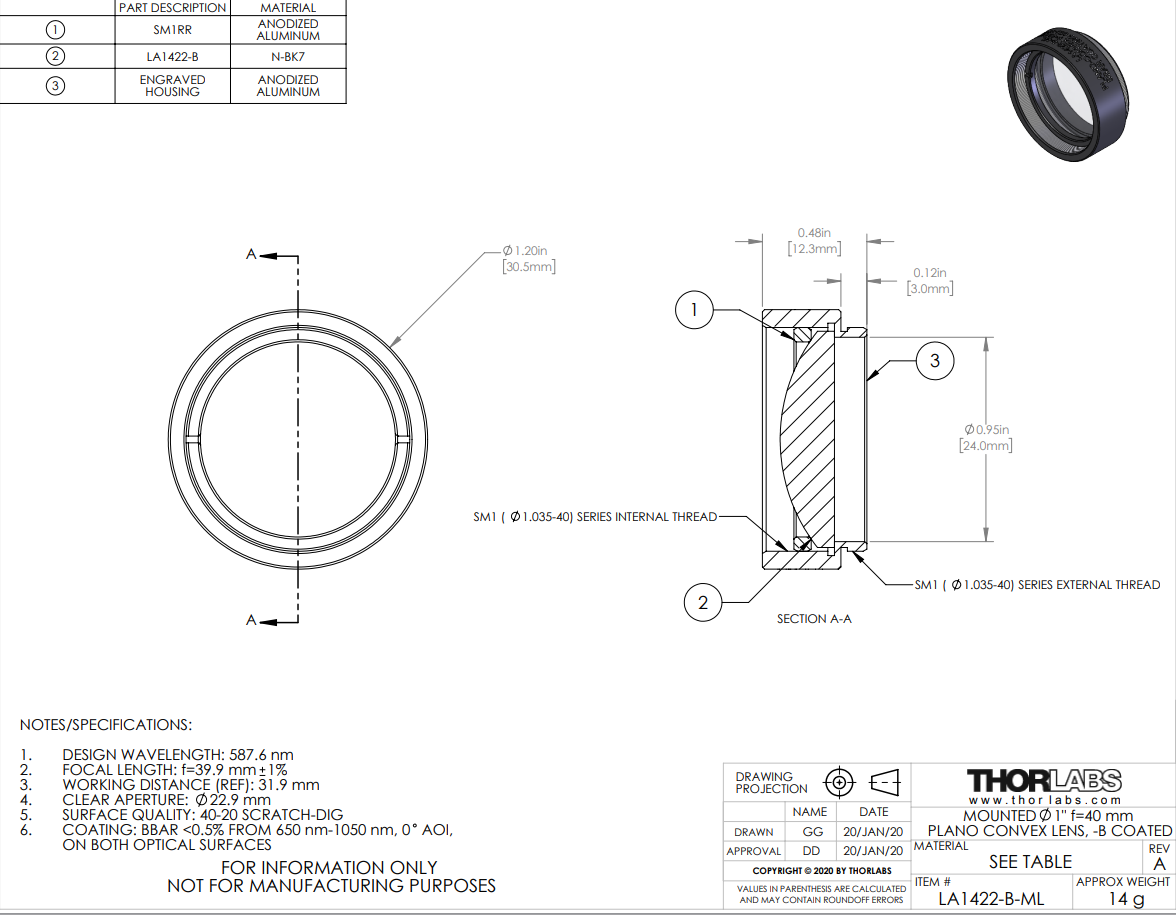 这些平凸透镜由N-BK7材料制造,它是符合RoHS标准的BK7玻璃,并且镀有增透膜,在650 - 1050 nm波长范围上提供每个表面< 0.5%的平均反射率。N-BK7是制造高性能光学元件最广泛使用的光学玻璃之一。当紫外熔融石英的额外好处(即良好的紫外透过率和较低的热膨胀系数)不那么必要时,通常会选择该材料。这些Ø1/2英寸,Ø1英寸、Ø1.5英寸和Ø2英寸的透镜分别安装在兼容SM05 -(0.535"-40),SM1-(1.035"-40)、SM1.5(1.535"-40)和SM2-(2.035"-40)螺纹的安装座上,从而兼容我们的SM螺纹透镜套管。每个透镜套筒都刻有型号,透镜类型,焦距和指向透镜弯曲表面的箭头,以及增透膜范围。