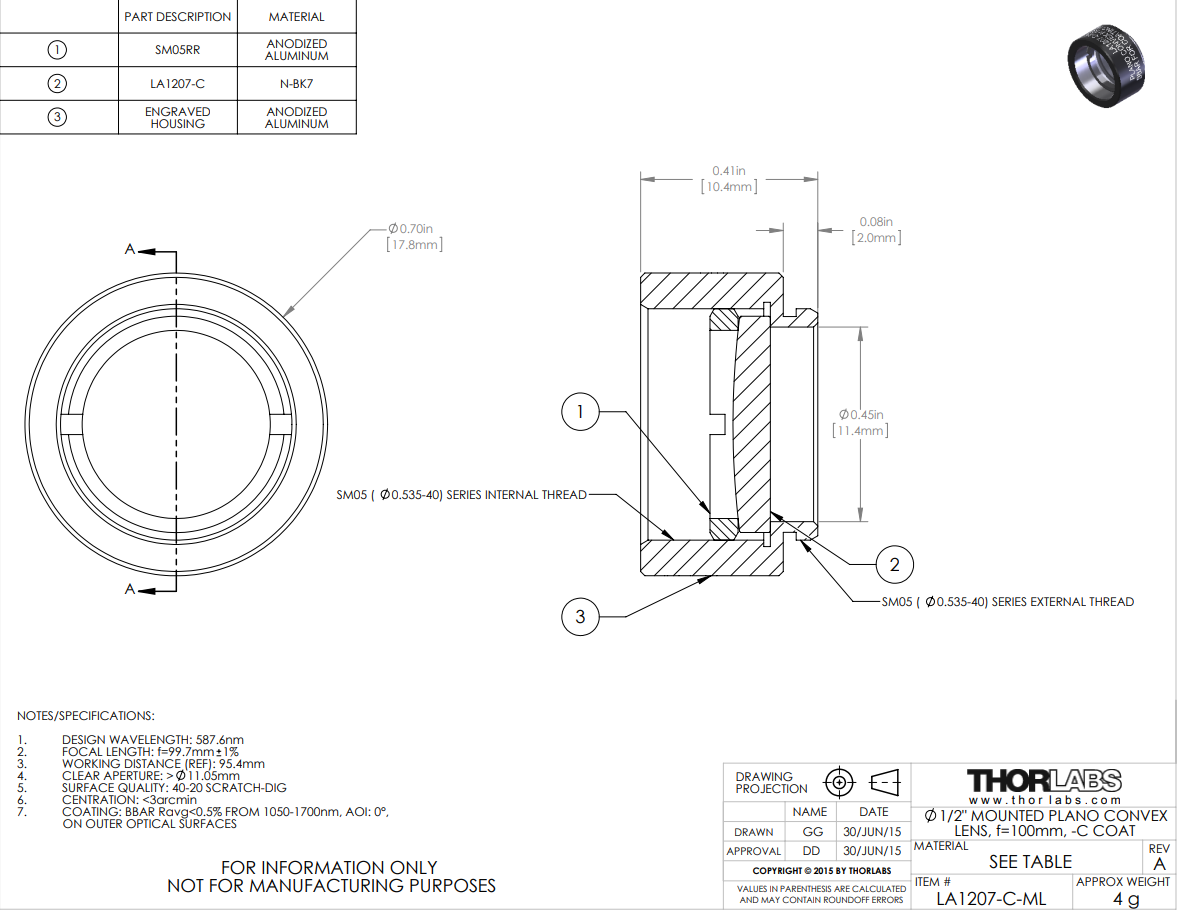 这些平凸透镜由N-BK7材料制造,它是符合RoHS标准的BK7玻璃,并且镀有增透膜,在1050 - 1620 nm或1050 - 1700 nm波长范围上提供每个表面< 0.5%的平均反射率。N-BK7是制造高性能光学元件最广泛使用的光学玻璃之一。当紫外熔融石英的额外好处(即良好的紫外透过率和较低的热膨胀系数)不那么必要时,通常会选择该材料。这些Ø1/2英寸、Ø1英寸、Ø1.5英寸和Ø2英寸的透镜分别安装在兼容SM05-(0.535"-40)、SM1-(1.035"-40)、SM1.5(1.535"-40)和SM2-(2.035"-40)螺纹的安装座上,从而兼容我们的SM螺纹透镜套管。每个透镜套筒都刻有型号,透镜类型,焦距和指向透镜弯曲表面的箭头,以及增透膜范围。