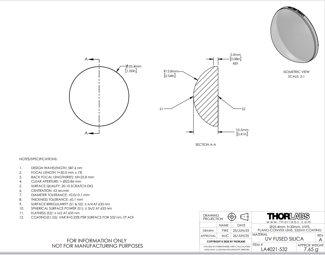 Thorlabs索雷博 LA4021-532 紫外熔融石英平凸球透镜