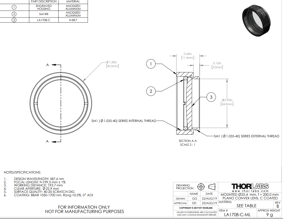 这些平凸透镜由N-BK7材料制造,它是符合RoHS标准的BK7玻璃,并且镀有增透膜,在1050 - 1620 nm或1050 - 1700 nm波长范围上提供每个表面< 0.5%的平均反射率。N-BK7是制造高性能光学元件最广泛使用的光学玻璃之一。当紫外熔融石英的额外好处(即良好的紫外透过率和较低的热膨胀系数)不那么必要时,通常会选择该材料。这些Ø1/2英寸、Ø1英寸、Ø1.5英寸和Ø2英寸的透镜分别安装在兼容SM05-(0.535"-40)、SM1-(1.035"-40)、SM1.5(1.535"-40)和SM2-(2.035"-40)螺纹的安装座上,从而兼容我们的SM螺纹透镜套管。每个透镜套筒都刻有型号,透镜类型,焦距和指向透镜弯曲表面的箭头,以及增透膜范围。