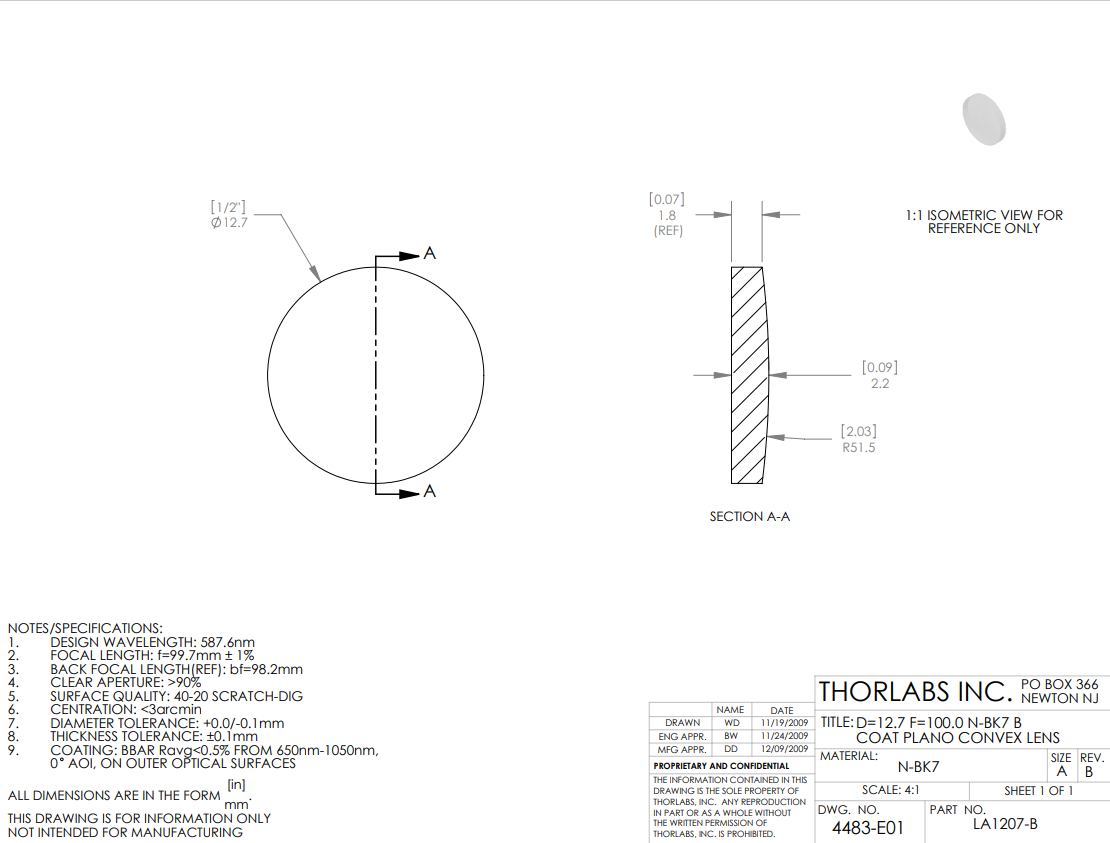 其中n是折射率,R是透镜表面的曲率半径。这些透镜使用阿贝数为64.17的N-BK7材料生产;阿贝数是色散指标。
