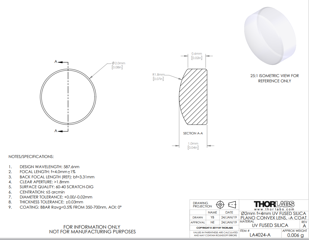 这些紫外熔石英平凸透镜的尺寸可选范围为Ø2 mm - Ø75 mm(见表1.1),且两面镀有增透膜,适用波长范围为350 - 700 nm。由于紫外级熔融石英在深紫外波长范围具有高透射率,同时在激光诱导下几乎没有荧光发射(用193 nm测试过),因此非常适合从紫外到近红外应用。此外,紫外级熔融石英比N-BK7玻璃具有更好的均匀性和更低的热膨胀系数。