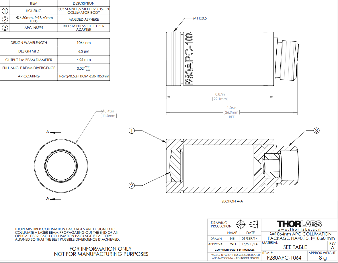 Thorlabs索雷博 F280APC-1064 光纤准直器