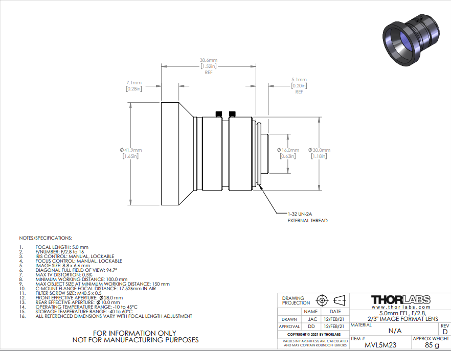 Thorlabs索雷博 MVL5M23 定焦镜头