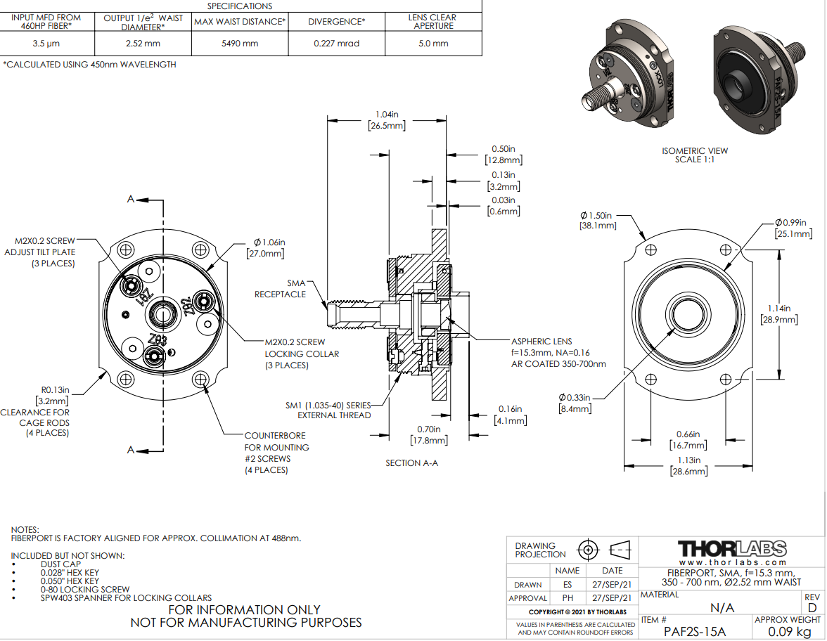 Thorlabs索雷博 PAF2S-15A 带非球面透镜