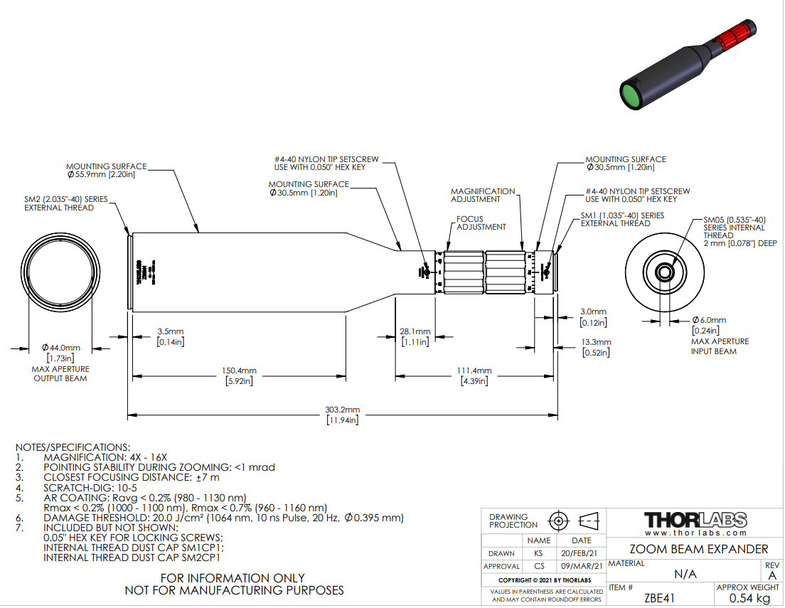 | ZBE11 | 0.5X - 2.5X | 10.9 mm @ 0.5X 8.0 mm @ 2.5X | 10.0 mm @ 0.5X 7.0 mm @ 2.5X | Internal: SM05 External: SM1 | SM1 | Ravg < 0.2% (980 - 1130 nm)