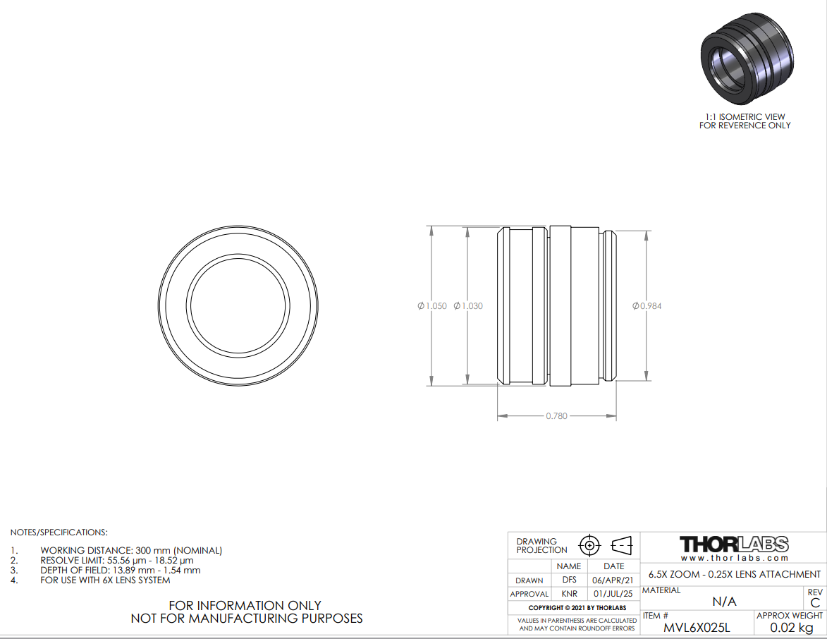 Thorlabs索雷博 MVL6X025L 6.5X系统放大镜头附加透镜