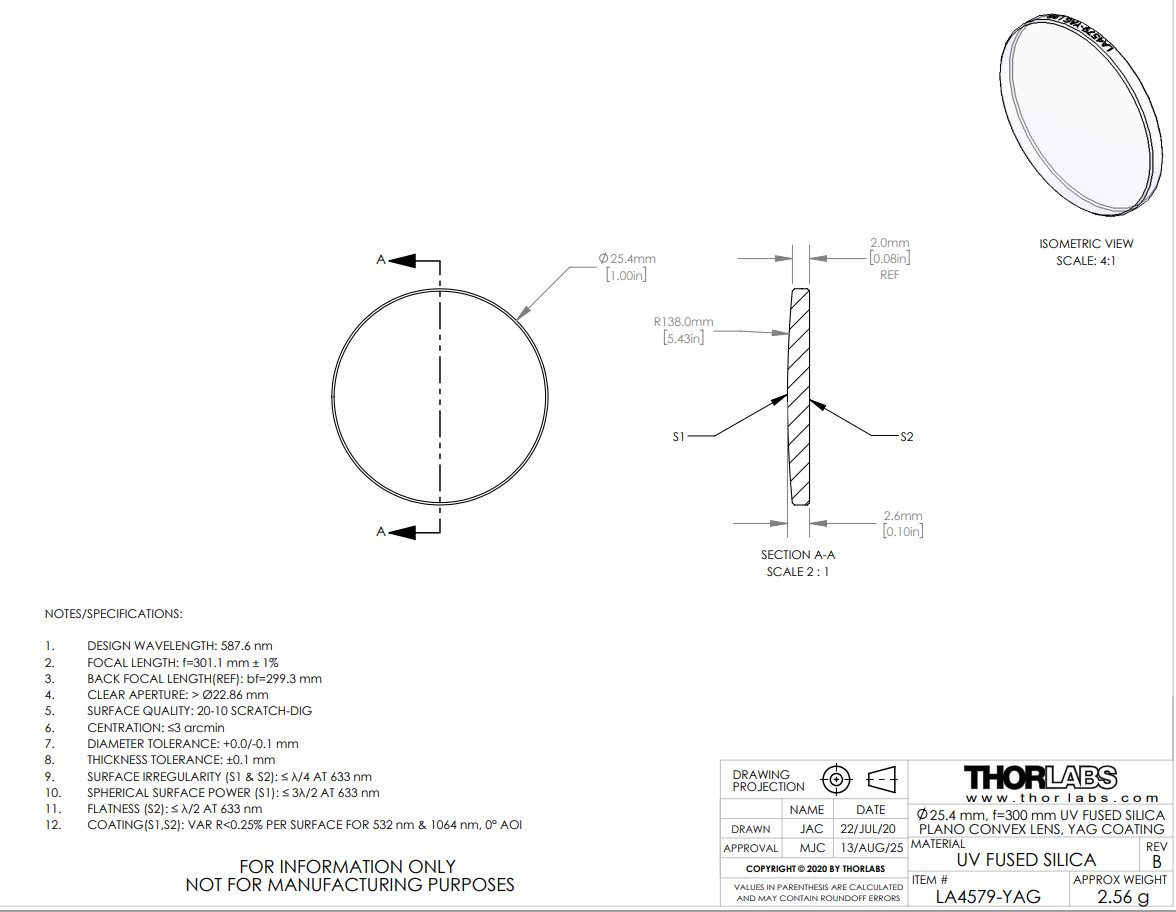 Thorlabs索雷博 LA4579-YAG 紫外熔融石英平凸球透镜