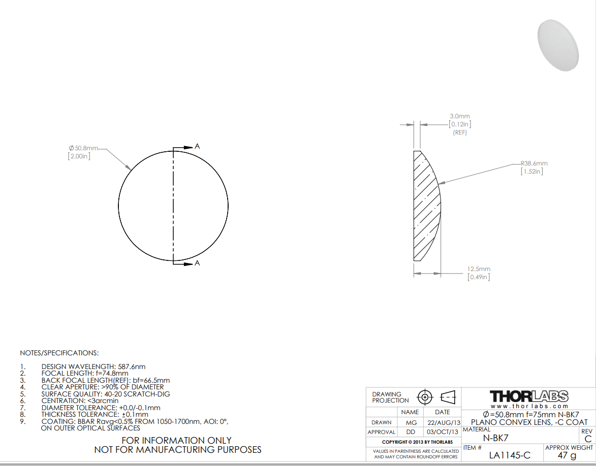 Thorlabs索雷博 LA1145-C 平凸透镜