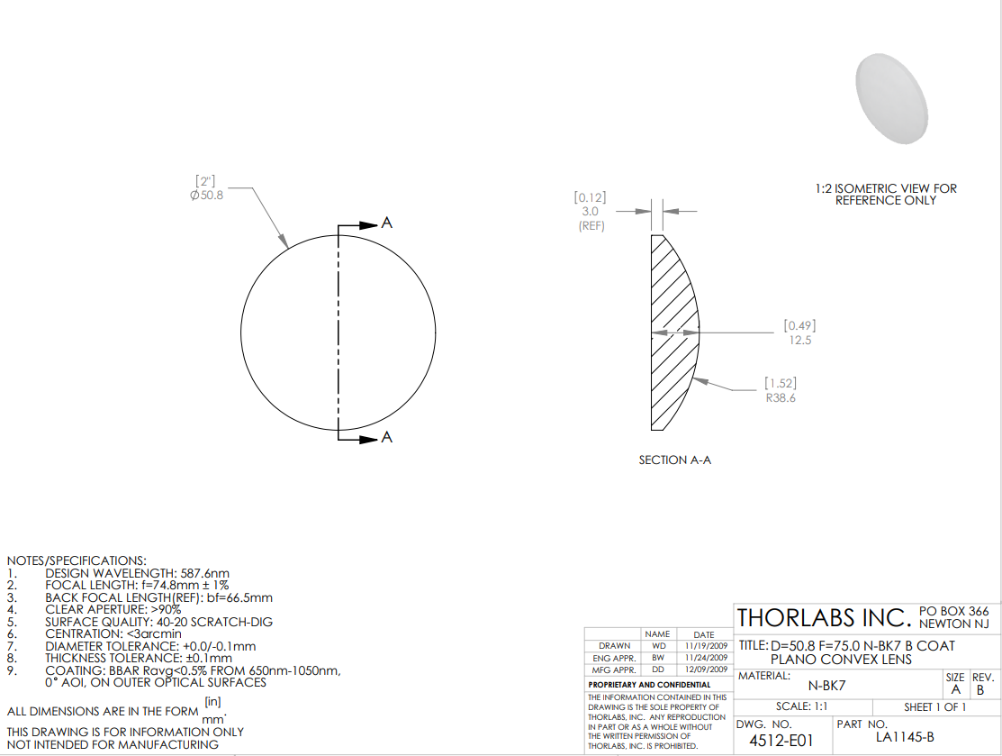 其中n是折射率,R是透镜表面的曲率半径。这些透镜使用阿贝数为64.17的N-BK7材料生产;阿贝数是色散指标。