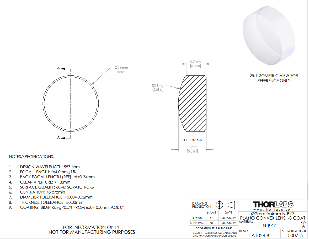 其中n是折射率,R是透镜表面的曲率半径。这些透镜使用阿贝数为64.17的N-BK7材料生产;阿贝数是色散指标。