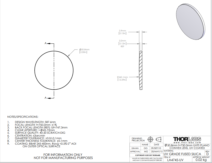 Thorlabs索雷博 LA4745-UV 平凸透镜