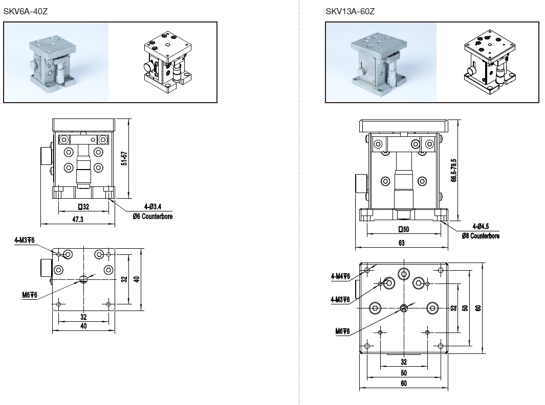 SKV 系列是采用直顶式结构的高精密手动升降滑台。该系列产品采用分厘卡驱动,使用直线滑块导轨导向,保证台面升降时具有很好的运动精度。台面多种标准孔位的安装孔适合不同需要,下方标准固定孔方便将其与其他滑台连接,组成多维移动台。