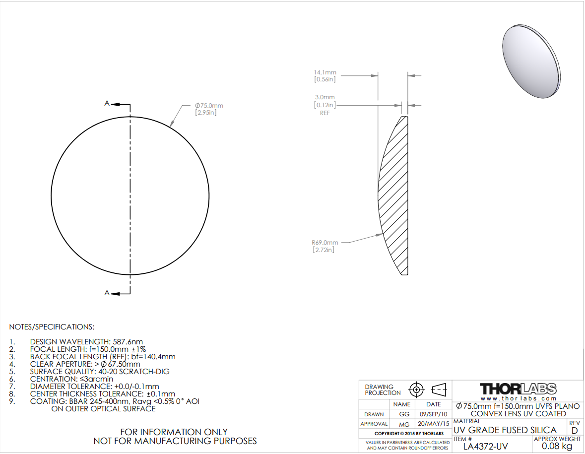 Thorlabs索雷博 LA4372-UV 平凸透镜