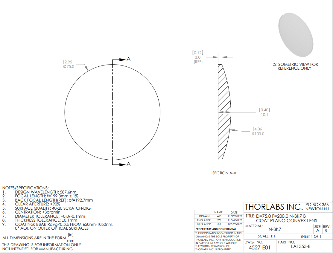 其中n是折射率,R是透镜表面的曲率半径。这些透镜使用阿贝数为64.17的N-BK7材料生产;阿贝数是色散指标。