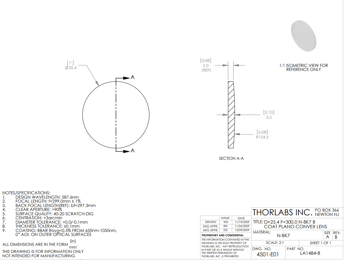 其中n是折射率,R是透镜表面的曲率半径。这些透镜使用阿贝数为64.17的N-BK7材料生产;阿贝数是色散指标。