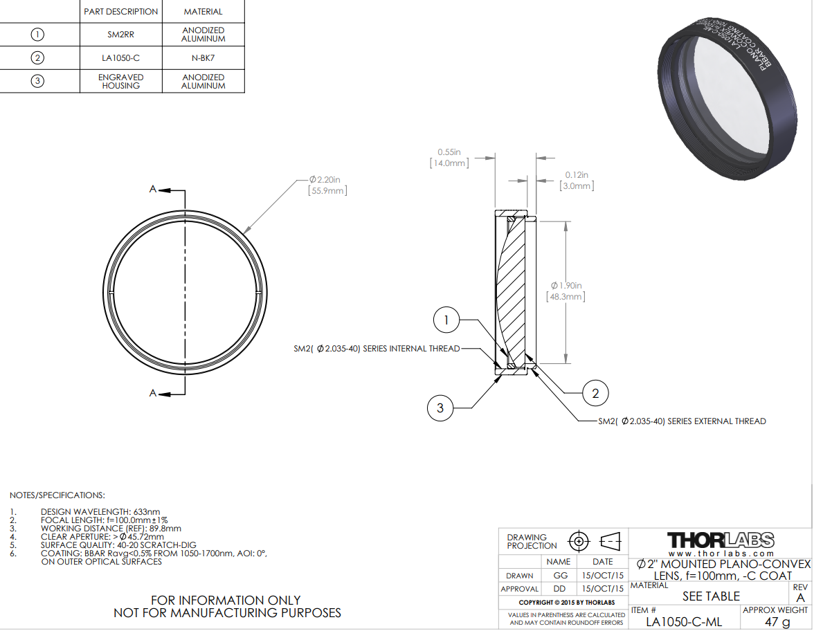 这些平凸透镜由N-BK7材料制造,它是符合RoHS标准的BK7玻璃,并且镀有增透膜,在1050 - 1620 nm或1050 - 1700 nm波长范围上提供每个表面< 0.5%的平均反射率。N-BK7是制造高性能光学元件最广泛使用的光学玻璃之一。当紫外熔融石英的额外好处(即良好的紫外透过率和较低的热膨胀系数)不那么必要时,通常会选择该材料。这些Ø1/2英寸、Ø1英寸、Ø1.5英寸和Ø2英寸的透镜分别安装在兼容SM05-(0.535"-40)、SM1-(1.035"-40)、SM1.5(1.535"-40)和SM2-(2.035"-40)螺纹的安装座上,从而兼容我们的SM螺纹透镜套管。每个透镜套筒都刻有型号,透镜类型,焦距和指向透镜弯曲表面的箭头,以及增透膜范围。