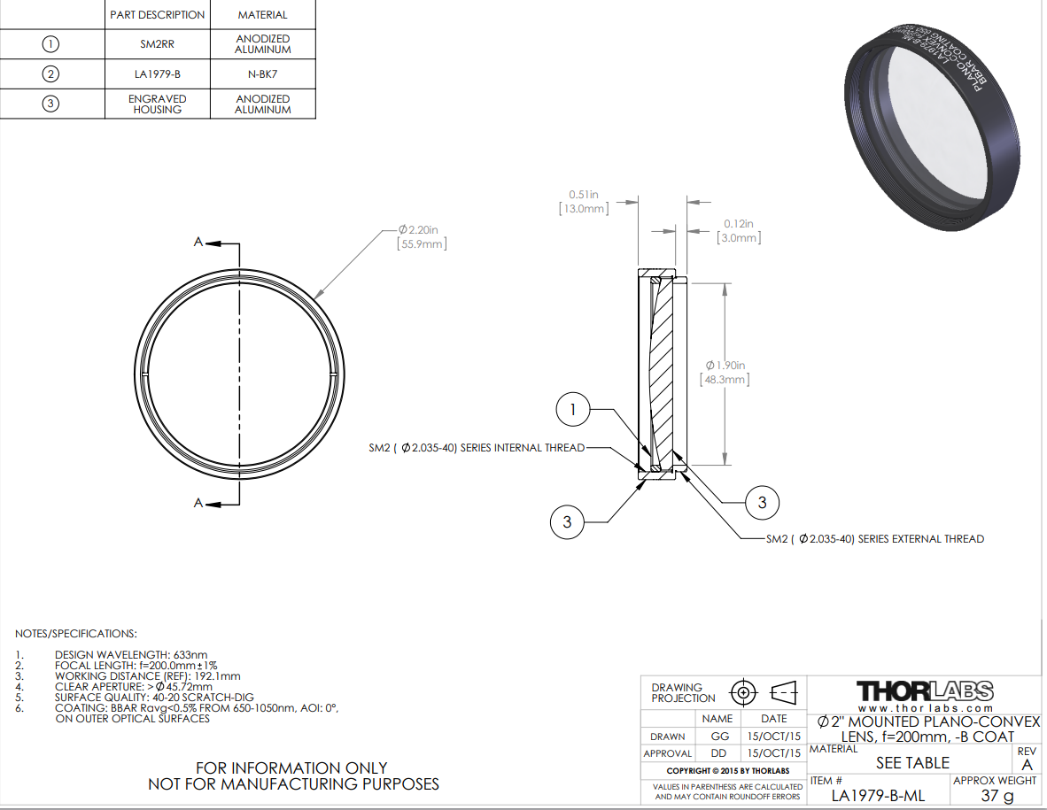 这些平凸透镜由N-BK7材料制造,它是符合RoHS标准的BK7玻璃,并且镀有增透膜,在650 - 1050 nm波长范围上提供每个表面< 0.5%的平均反射率。N-BK7是制造高性能光学元件最广泛使用的光学玻璃之一。当紫外熔融石英的额外好处(即良好的紫外透过率和较低的热膨胀系数)不那么必要时,通常会选择该材料。这些Ø1/2英寸,Ø1英寸、Ø1.5英寸和Ø2英寸的透镜分别安装在兼容SM05 -(0.535"-40),SM1-(1.035"-40)、SM1.5(1.535"-40)和SM2-(2.035"-40)螺纹的安装座上,从而兼容我们的SM螺纹透镜套管。每个透镜套筒都刻有型号,透镜类型,焦距和指向透镜弯曲表面的箭头,以及增透膜范围。