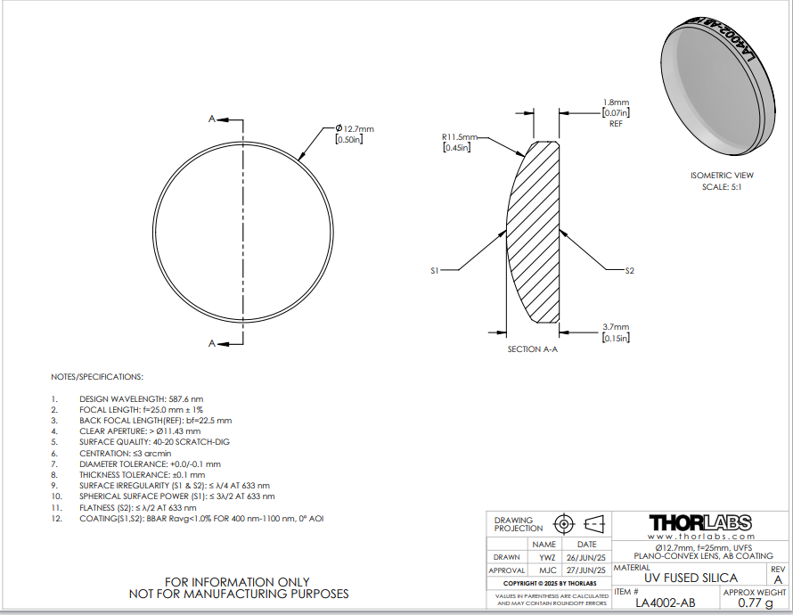 Thorlabs索雷博 LA4002-AB 紫外熔融石英平凸球透镜