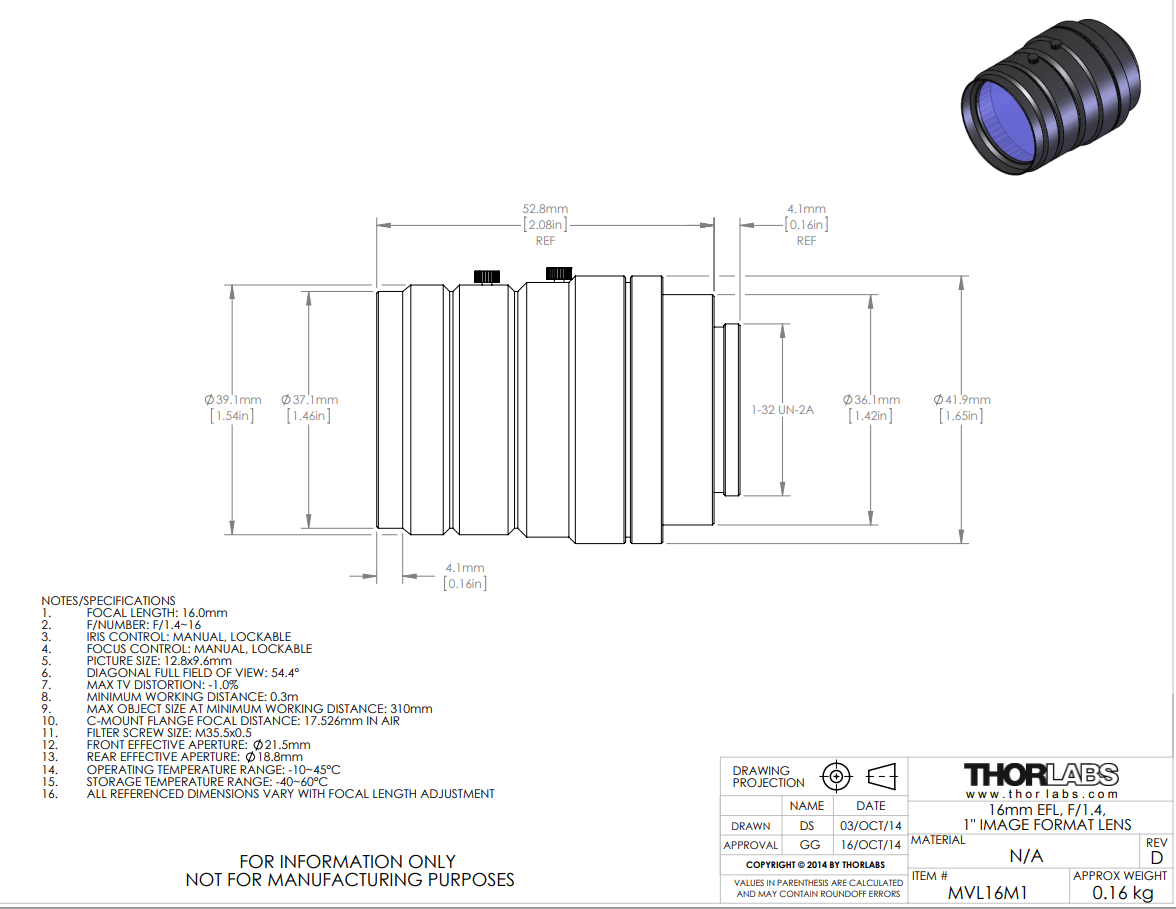 Thorlabs索雷博 MVL16M1 定焦镜头