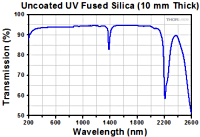 图2.1是入射光垂直于10 mm厚未镀膜UV熔融石英样品表面时测量的透过率曲线图,包含表面反射。本页出售的透镜具有Thorlabs的532 AR V形膜,在532 nm下比未镀膜同类透镜的透过率更高。如要查看我们未镀膜的UV熔融石英透镜,请点击这里。