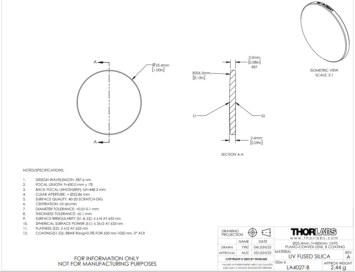 Thorlabs索雷博 LA4027-B 紫外熔融石英平凸球透镜