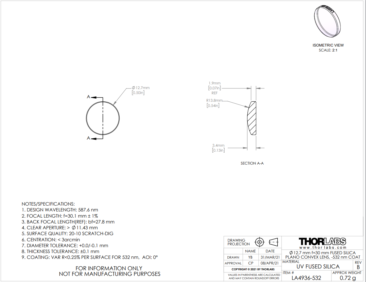 Thorlabs索雷博 LA4936-532 紫外熔融石英平凸球透镜