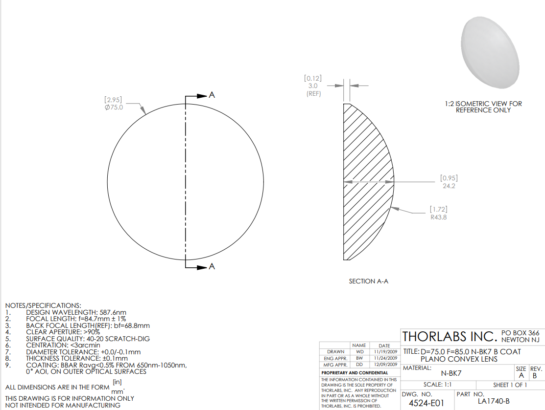 其中n是折射率,R是透镜表面的曲率半径。这些透镜使用阿贝数为64.17的N-BK7材料生产;阿贝数是色散指标。