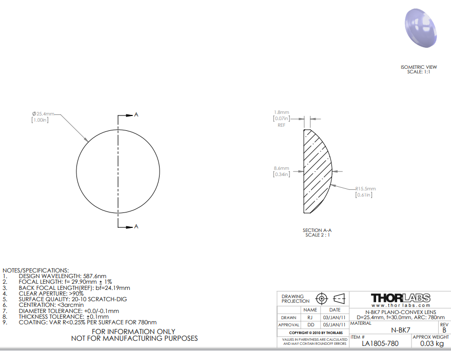为了最小化引入的球差,在聚焦准直光束时应使其入射到透镜曲面上,而在准直点光源发出的光束时应使其入射到透镜平面上。透镜焦距可用厚透镜简化公式 f=R/(n-1)计算,其中n是折射率,R是透镜凸面曲率半径。这种透镜采用N-BK7玻璃制造,阿贝数为64.17。阿贝数表征的是色散的大小。