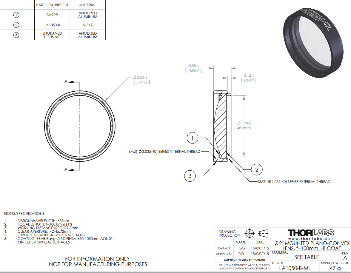 这些平凸透镜由N-BK7材料制造,它是符合RoHS标准的BK7玻璃,并且镀有增透膜,在650 - 1050 nm波长范围上提供每个表面< 0.5%的平均反射率。N-BK7是制造高性能光学元件最广泛使用的光学玻璃之一。当紫外熔融石英的额外好处(即良好的紫外透过率和较低的热膨胀系数)不那么必要时,通常会选择该材料。这些Ø1/2英寸,Ø1英寸、Ø1.5英寸和Ø2英寸的透镜分别安装在兼容SM05 -(0.535"-40),SM1-(1.035"-40)、SM1.5(1.535"-40)和SM2-(2.035"-40)螺纹的安装座上,从而兼容我们的SM螺纹透镜套管。每个透镜套筒都刻有型号,透镜类型,焦距和指向透镜弯曲表面的箭头,以及增透膜范围。