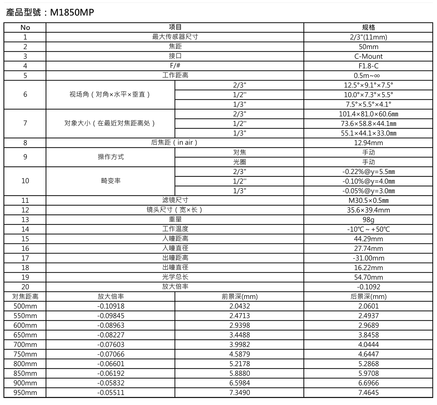 HUAGUO华国 M1850MP FA镜头