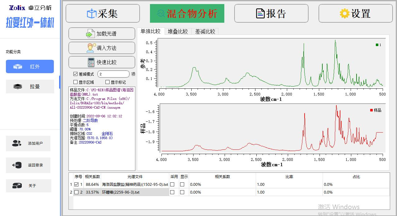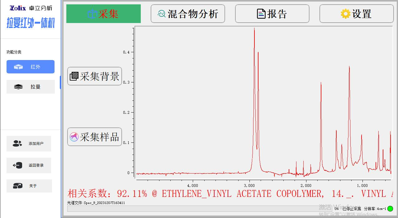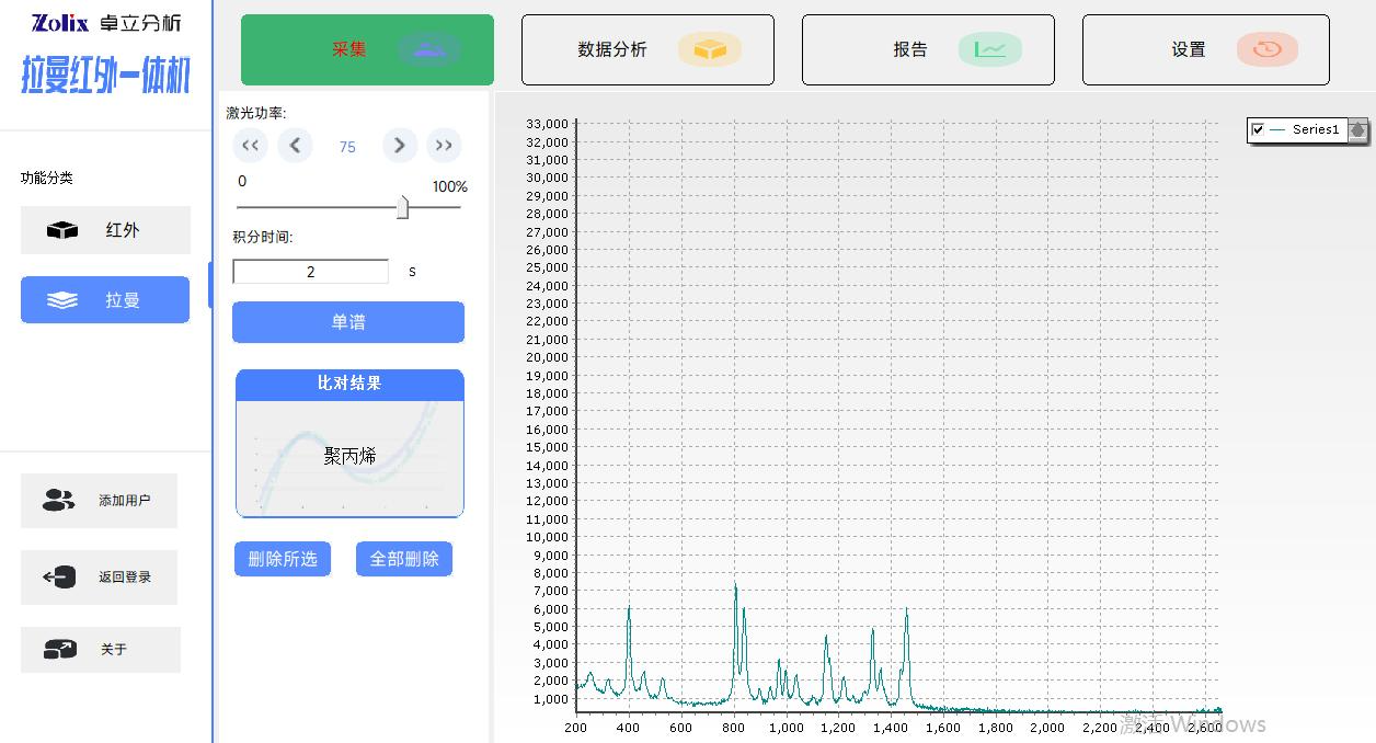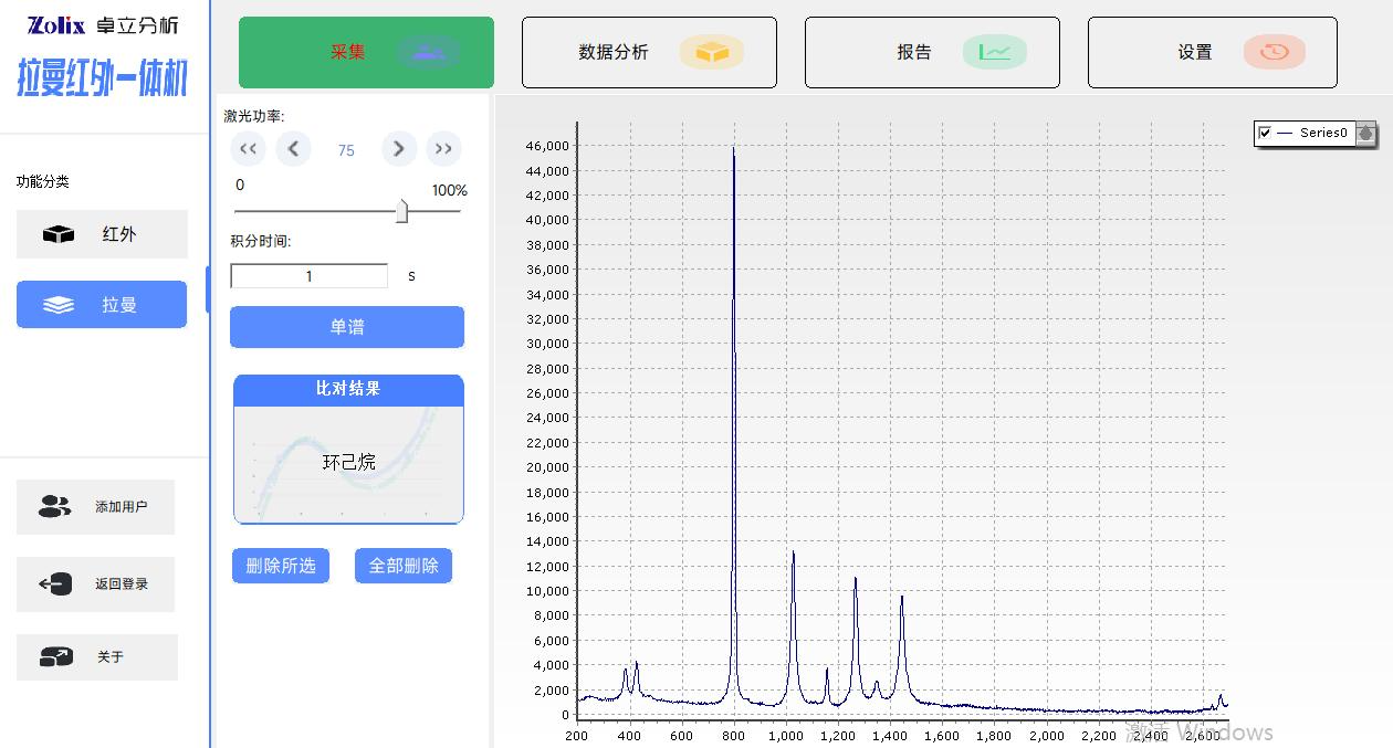 | 软件 | Win10操作系统下的全中文版处理软件, 红外模组功能包括:红外光谱测量功能、光谱数据预处理功能、谱图快速比较功能、标准谱峰检索功能、用户自建标准谱库功能、定量分析功能、自动扣除金刚石/CO2吸收峰功能、智能峰位识别报警功能、一键式测评功能、报告自动生成及打印功能等 拉曼模组功能包括:拉曼光谱测量功能、谱图快速比较功能、谱图自动保存、批量删除,报告自动生成及打印功能等 |