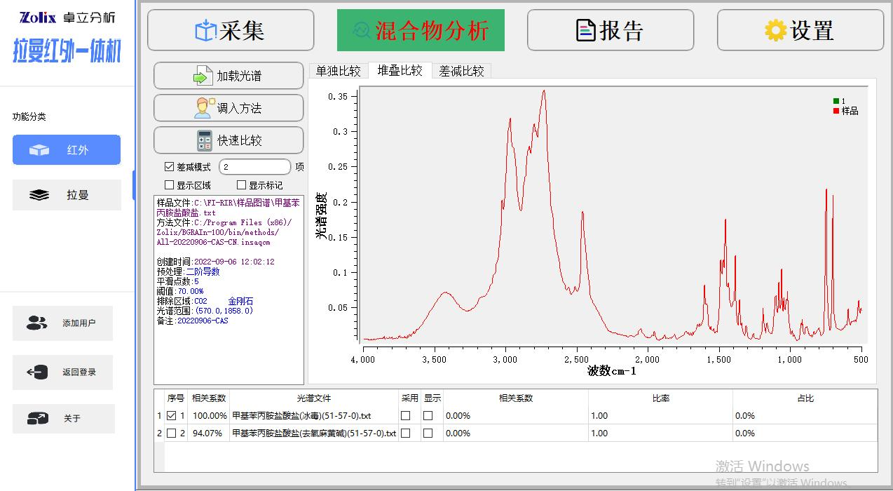 数据库 | 配置专业的红外谱图数据库,包括易制毒化学品、大麻素类物质、芬太尼类物质、新精活毒品、危险化学品等物质的谱图,其中毒品类谱图超过2400张 |