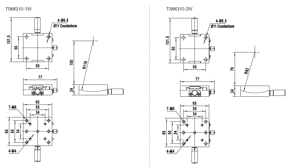 两者厚度相等均为24mm,TSMG10-1W 轴心距台面高为100 mm,TSMG10-2W 轴心距台面高为76mm,组维使用时TSMG10-1W 在下方。