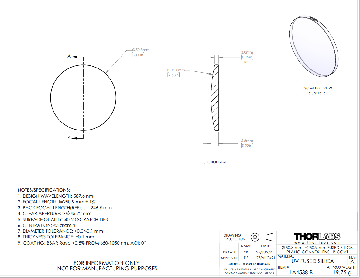 Thorlabs索雷博 LA4538-B 紫外熔融石英平凸球透镜