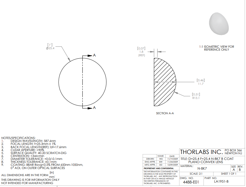 其中n是折射率,R是透镜表面的曲率半径。这些透镜使用阿贝数为64.17的N-BK7材料生产;阿贝数是色散指标。