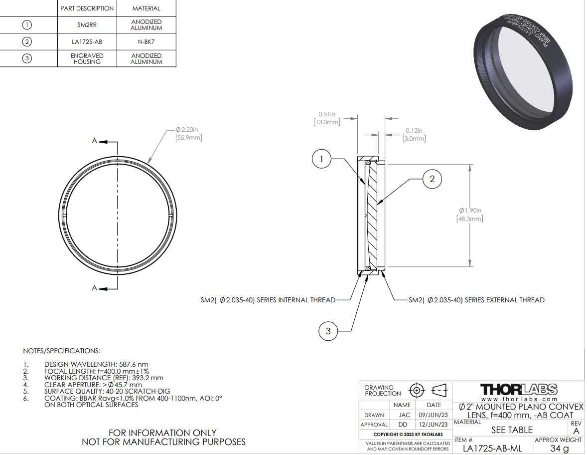 这些平凸透镜由符合RoHS标准的N-BK7材料制成,且镀有增透(AR)膜,在400 nm - 1100 nm波长范围内提供每个表面< 1.0%的平均反射率。N-BK7通常用于不需要紫外熔融石英的高级性能(如在紫外波段的高透过率和较低的热膨胀系数)的应用场合。这些Ø1/2英寸、Ø1英寸、Ø1.5英寸和Ø2英寸的透镜分别安装在兼容SM05(0.535"-40)、SM1(1.035"-40)、SM1.5 (1.535"-40)和SM2(2.035"-40)螺纹的安装座中,从而兼容我们的SM螺纹透镜套筒。SM螺纹卡环用于将透镜固定在安装座中。每个安装座都刻有产品型号、透镜类型、焦距、指向透镜曲面的箭头以及增透膜范围。