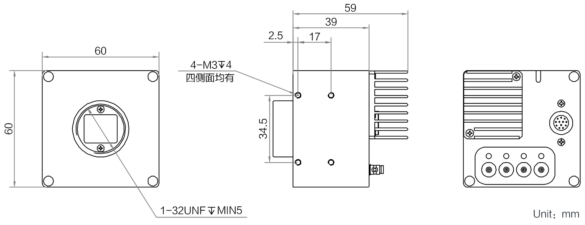 外形尺寸 | 60 mm × 60 mm × 59 mm(可选配散热鳍片) |