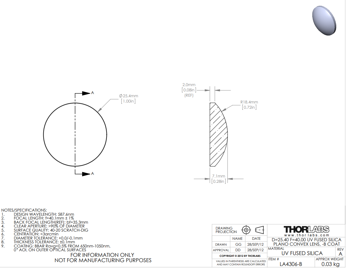 Thorlabs索雷博 LA4306-B 紫外熔融石英平凸球透镜