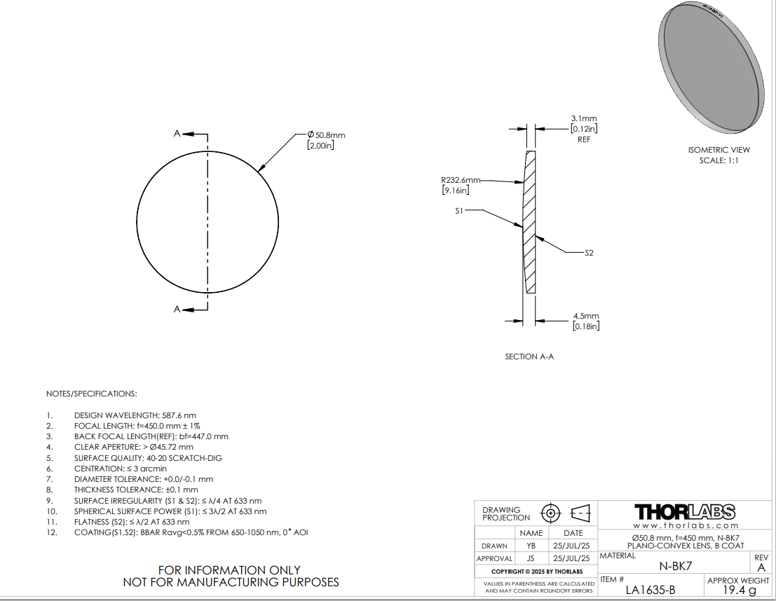 其中n是折射率,R是透镜表面的曲率半径。这些透镜使用阿贝数为64.17的N-BK7材料生产;阿贝数是色散指标。