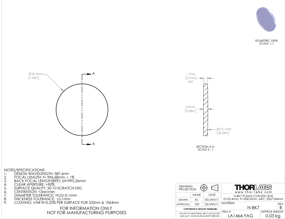 为了最小化球差,在聚焦准直光束时应从透镜的曲面入射,而在准直点光源发出的光束时应从透镜的平面入射。透镜焦距可用厚透镜简化公式 f=R/(n-1)计算,其中n是折射率,R是透镜凸面曲率半径。这种透镜采用N-BK7玻璃制造,阿贝数为64.17。阿贝数表征的是色散的大小。