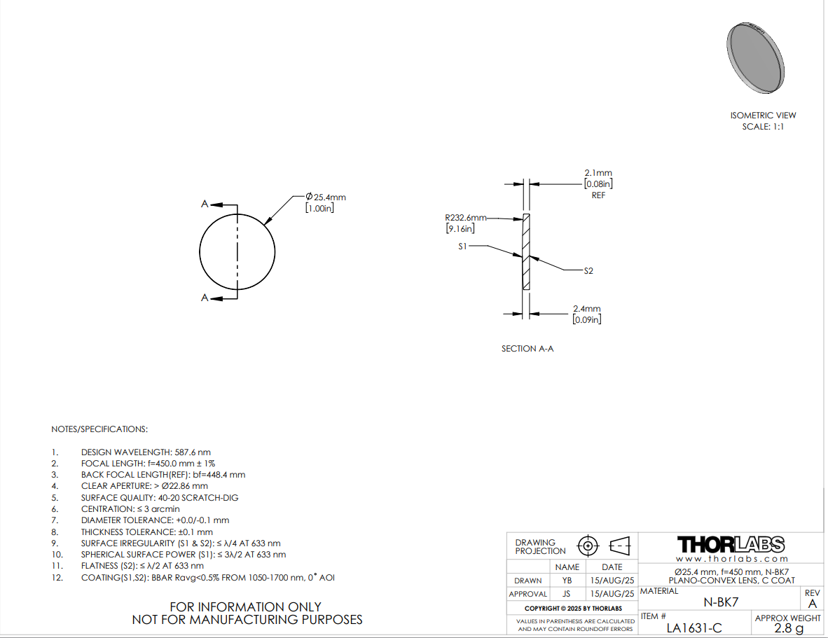 Thorlabs索雷博 LA1631-C 平凸透镜