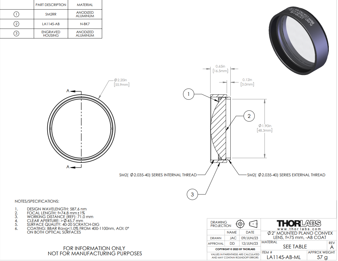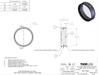 这些平凸透镜由符合RoHS标准的N-BK7材料制成,且镀有增透(AR)膜,在400 nm - 1100 nm波长范围内提供每个表面< 1.0%的平均反射率。N-BK7通常用于不需要紫外熔融石英的高级性能(如在紫外波段的高透过率和较低的热膨胀系数)的应用场合。这些Ø1/2英寸、Ø1英寸、Ø1.5英寸和Ø2英寸的透镜分别安装在兼容SM05(0.535"-40)、SM1(1.035"-40)、SM1.5 (1.535"-40)和SM2(2.035"-40)螺纹的安装座中,从而兼容我们的SM螺纹透镜套筒。SM螺纹卡环用于将透镜固定在安装座中。每个安装座都刻有产品型号、透镜类型、焦距、指向透镜曲面的箭头以及增透膜范围。