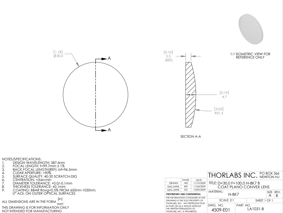 其中n是折射率,R是透镜表面的曲率半径。这些透镜使用阿贝数为64.17的N-BK7材料生产;阿贝数是色散指标。