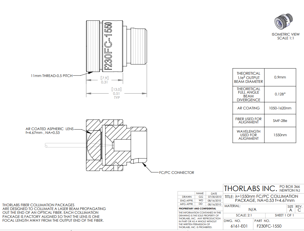 Thorlabs索雷博 F230FC-1550 光纤准直器