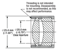 Thorlabs的这种双合透镜预先安装在刻有标识的Ø1英寸外壳中,以方便将这种光学元件安装到其他设备。每个标识包括部件号、增透膜范围、焦距和一个箭头(准直点光源时指示光传播的方向),还有一个无穷大符号,表明透镜具有无限共轭比(即如果在离透镜平面一倍焦距的地方放一点发散光源,那么从曲面射出的光线会被准直)。