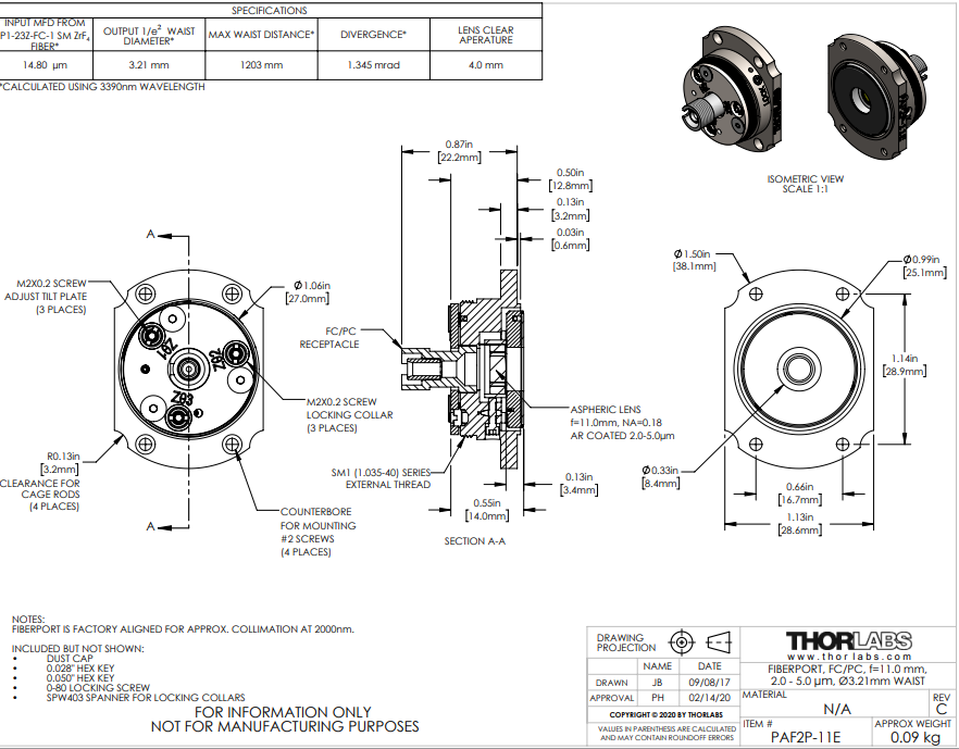 | PAF2P-11C | 11.0 mm | 10.4 µm | 2.09 mm | 1115 mm | 0.945 mrad | 4.4 mm | 0.20 | 1050 - 1620 nm | H-LAK54 | 0.87" (22.0 mm) |